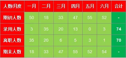 現假設某公司一年的前六個月中每個月的期初人數、期末人數、錄用人數、離職人數如下表所示: